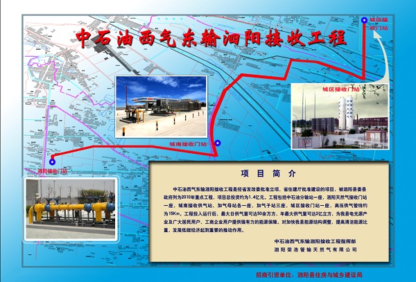 泗陽(yáng)天然氣項(xiàng)目三期工程即中石油西氣東輸泗陽(yáng)接收工程,是經(jīng)省發(fā)改委批準(zhǔn)立項(xiàng)、省住建廳批準(zhǔn)建設(shè)的項(xiàng)目,是泗陽(yáng)縣委、縣政府2010年重點(diǎn)民生工程,項(xiàng)目總投資約為1.2億元。工程包括泗陽(yáng)天然氣接收門站一座,城南高中壓調(diào)壓站、壓縮母站和加氣站各一座,城區(qū)高中壓調(diào)壓站加氣站各一座,高壓供氣管道15公里。工程于2010年8月15日開工,12月28日全面竣工,2011年1月28日試運(yùn)行,2月28日正式分輸供氣。2011年3月19日,泗陽(yáng)縣委、縣政府在榮浩集團(tuán)辦公大樓前舉行了隆重的投產(chǎn)通氣儀式,宿遷市副市長(zhǎng)趙深、泗陽(yáng)縣委書記李榮錦等四套班子領(lǐng)導(dǎo)出席了儀式;中石油西氣東輸銷售公司總經(jīng)理助理李世泉同志也出席了投產(chǎn)儀式,并發(fā)表了熱情洋溢的講話。該工程投入運(yùn)行后,最大日供氣量可達(dá)200余萬立方米,年最大供氣量可達(dá)6億立方米,為泗陽(yáng)及周邊縣市眾多工商企業(yè)用戶提供強(qiáng)有力的能源保障,對(duì)加快蘇北能源結(jié)構(gòu)調(diào)整、提高清潔能源比重、發(fā)展低碳經(jīng)濟(jì)、促進(jìn)節(jié)能減排都將起到重要的推動(dòng)作用。